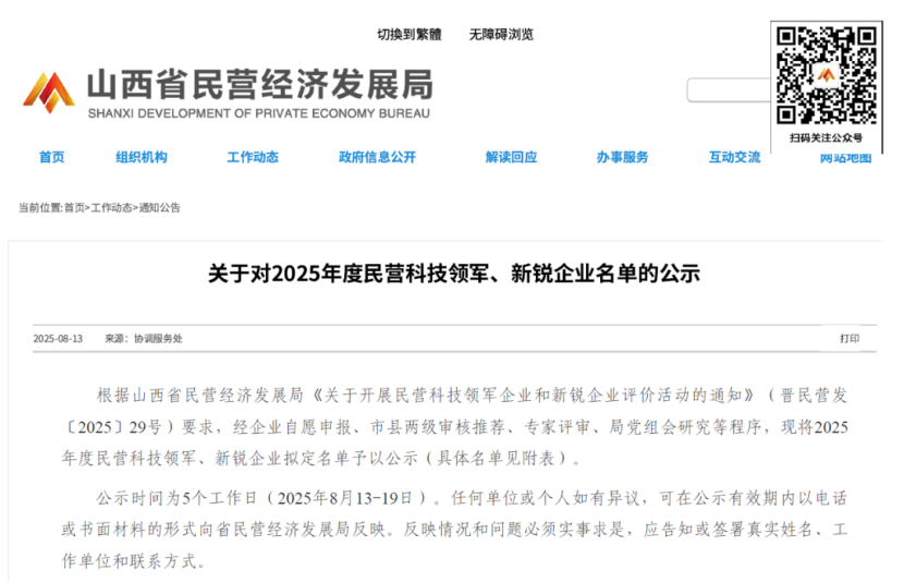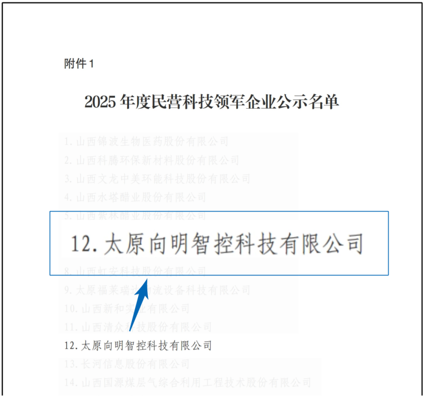 近日,山西省民营经济发展局正式公布了2025年度民营科技领军企业及民营科技新锐企业名单。向明智控凭借其在技术创新与行业引领方面的突出表现,成功入选2025年度山西省民营科技领军企业。